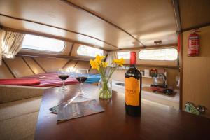 Inside, the boat features two bedrooms along with a living room that includes a sofa bed and a dining area adjacent to a kitchenette equipped with a stovetop. One bathroom comes supplied with free toiletries. Linens, towels, and heating are provided throughout for comfort. Large windows offer views over the river and cityscape while outdoor furniture is available on the garden terrace.