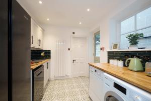Inside, the townhouse features a living room with a flat-screen TV and three bathrooms. Guests can prepare meals in the fully equipped kitchen while benefiting from heating and laundry facilities including a washing machine. One bedroom includes a crib, making it suitable for families.